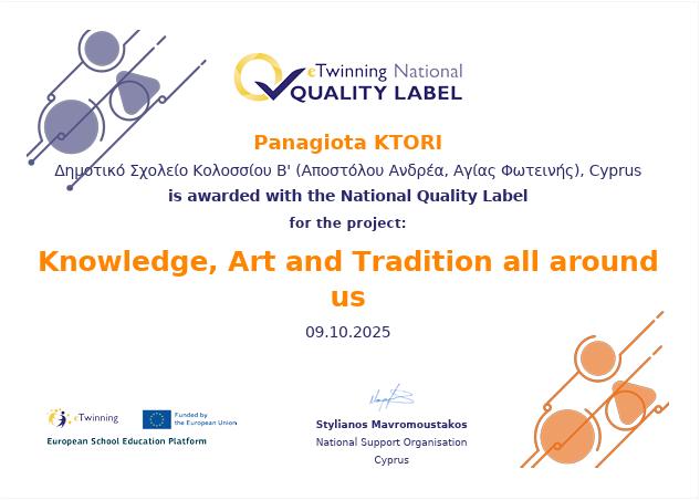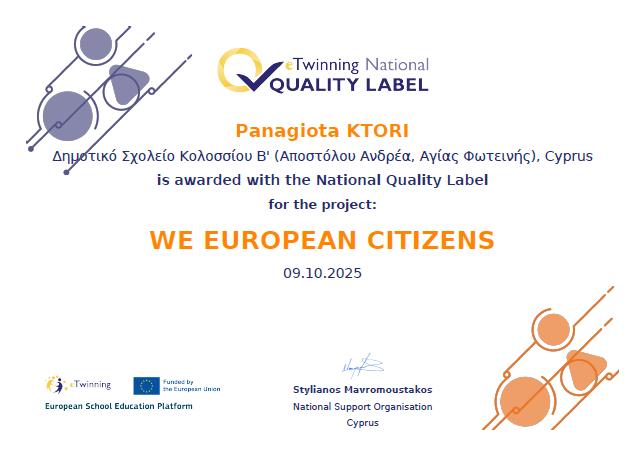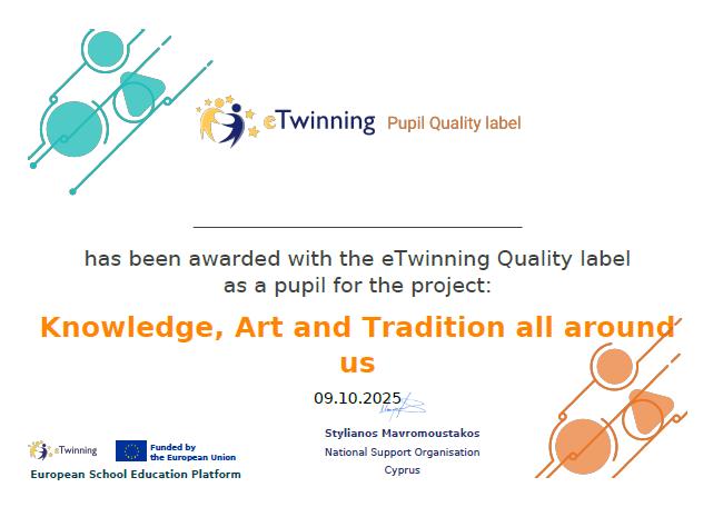 Τα προγράμματα που υλοποιήθηκαν το 2024-2025, "We European Citizens" και "Knowledge, Art and Tradition Around us" βραβεύτηκαν τον Οκτώβριο του 2025 με Εθνική Ετικέτα Ποιότητας ως αναγνώριση της εκπαιδευτικής τους αξίας.