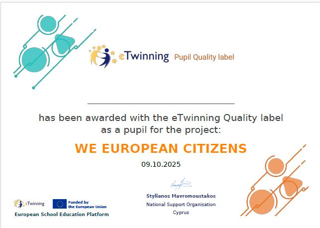 Τη φετινή σχολική χρονιά το σχολείο μας βραβεύτηκε με την ετικέτα eTwinning School Label προσδίδοντάς του αναγνώριση για το εκπαιδευτικό του έργο.